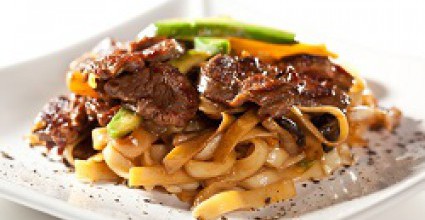 Лапша жареная с мясом, овощами и соусом